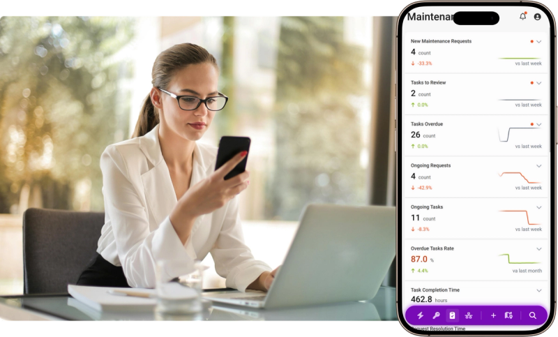 Dashboards show systems performance, alarms, overdue tasks and energy. Export to finance and BI, or share summaries to owners.